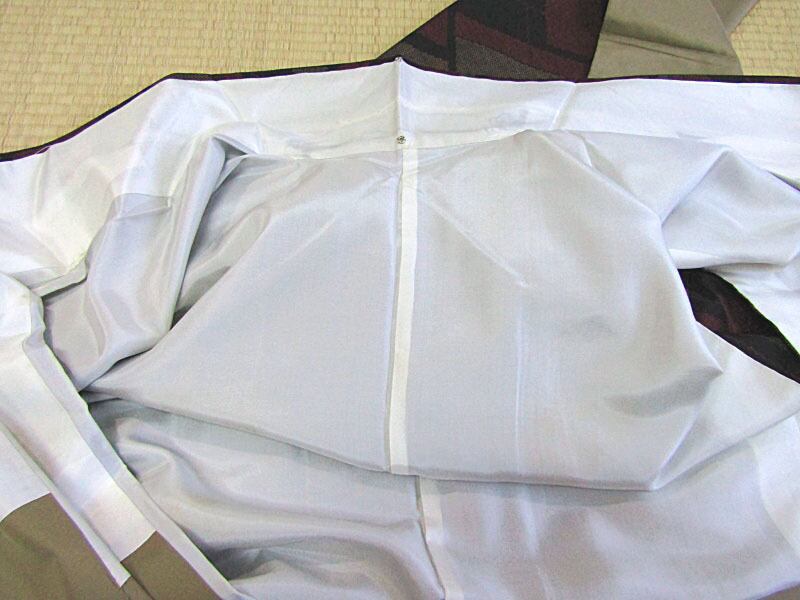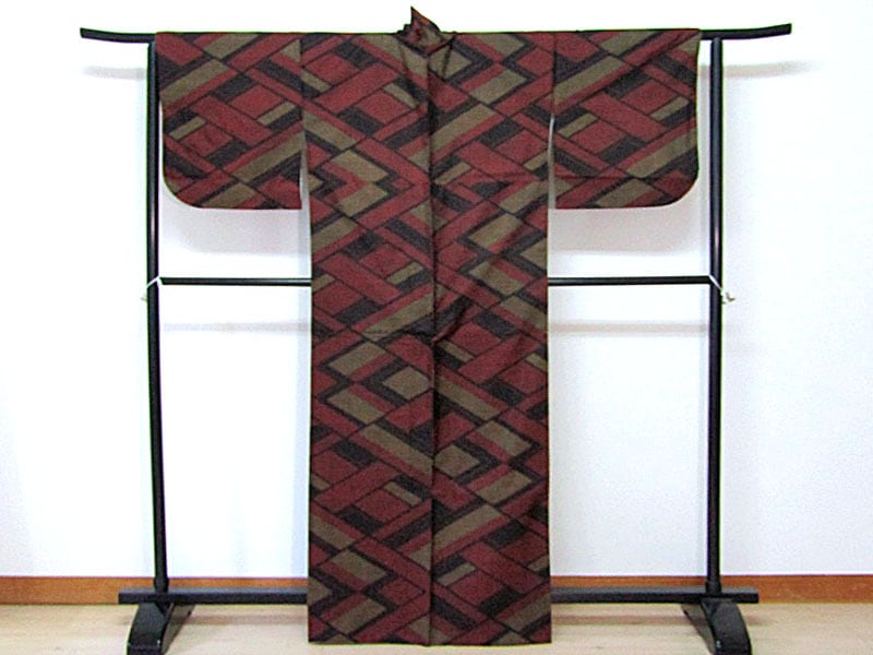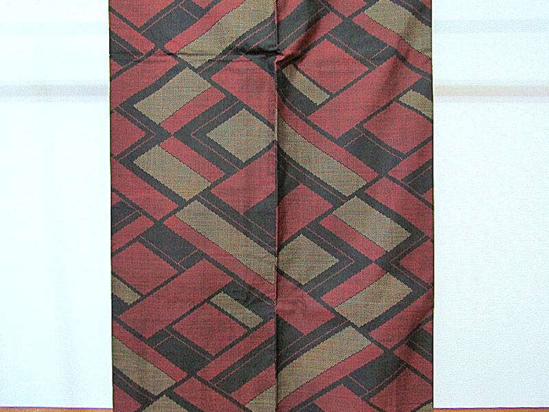 黒地?臙脂と金茶?網代文柄の本場大島紬きものです。