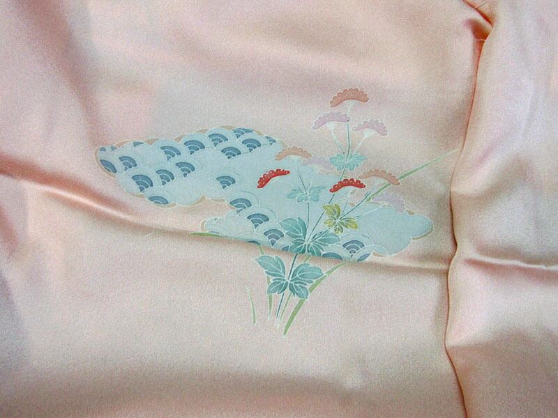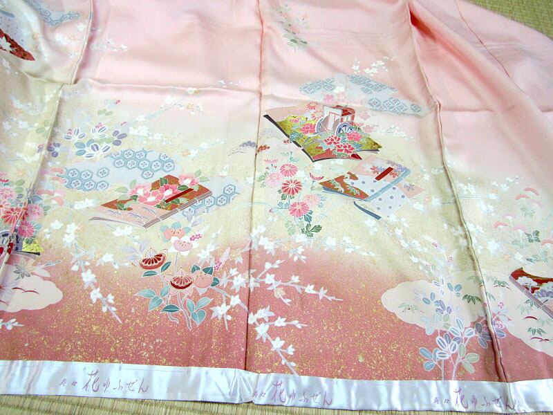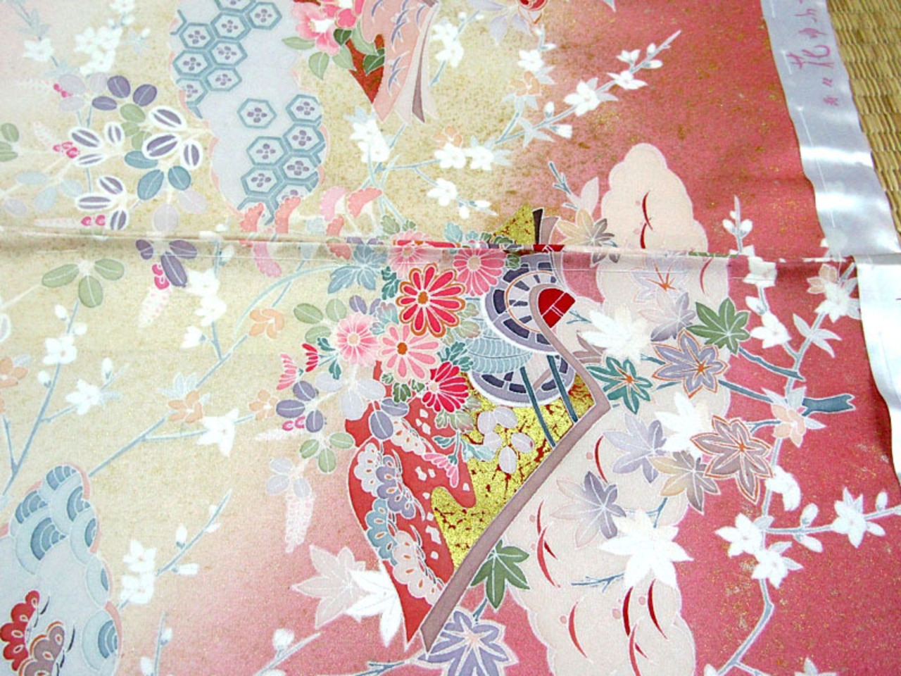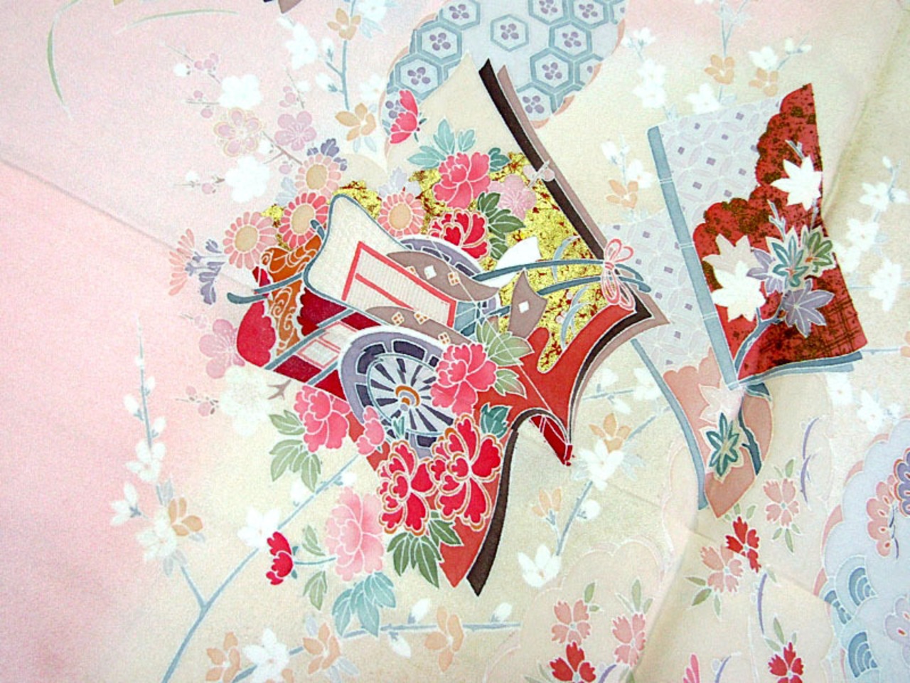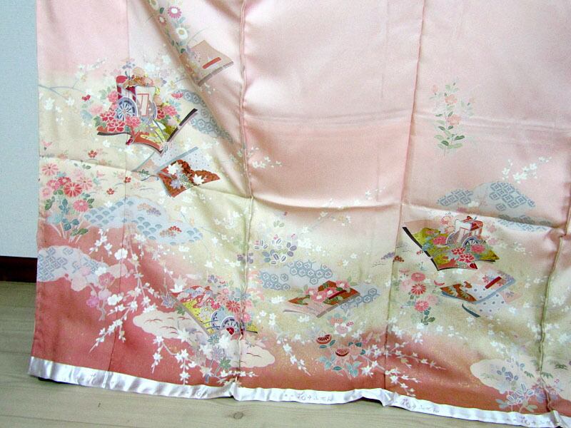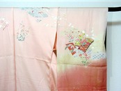 ピンク地に冊子と御所車の柄が施された美しい訪問着です。